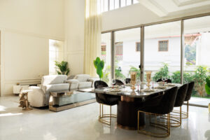 As you enter, the home unfolds with grace. A console table in the foyer offers an understated prelude to what follows. To the left, the space opens into a double-height living room where a richly detailed ceiling draws the eye upward, emphasizing both scale and symmetry. Consequently, this central volume becomes the heart of the home — open, light-filled, and deeply connected to family life and outdoor views.