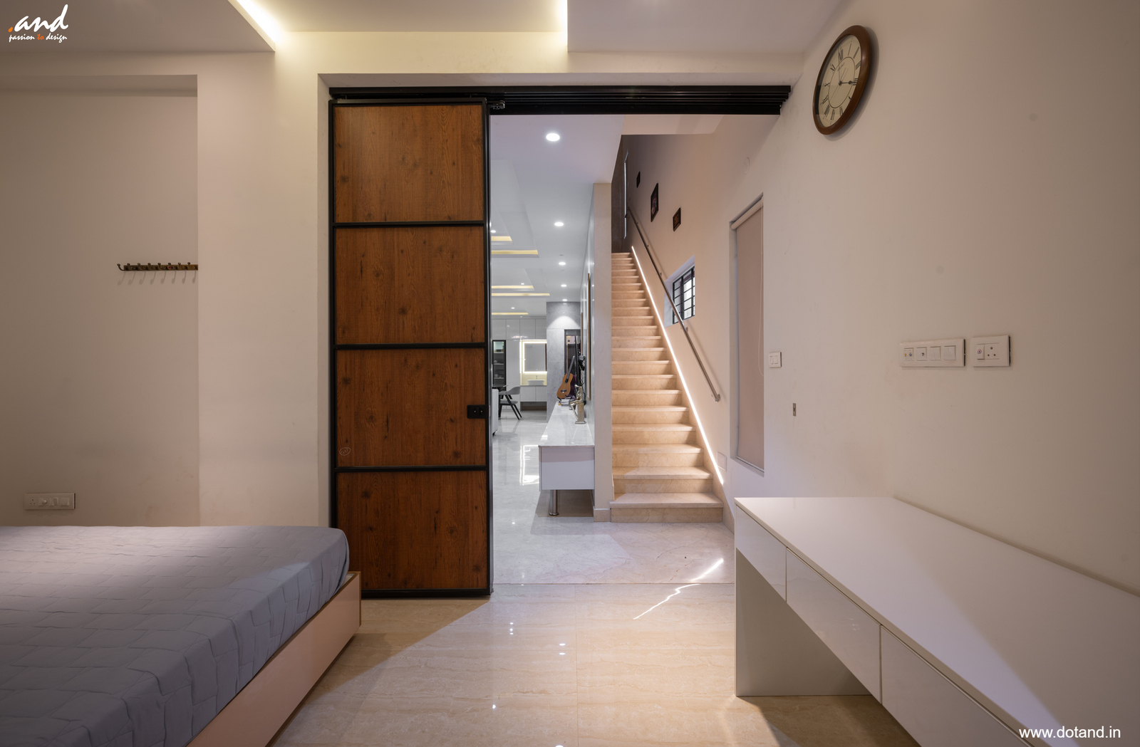 Upstairs, the bedrooms are quiet retreats. Large windows keep them bright during the day, while carefully placed lighting creates a softer mood at night. Bathrooms follow the same approach: neat, functional, and free of excess.