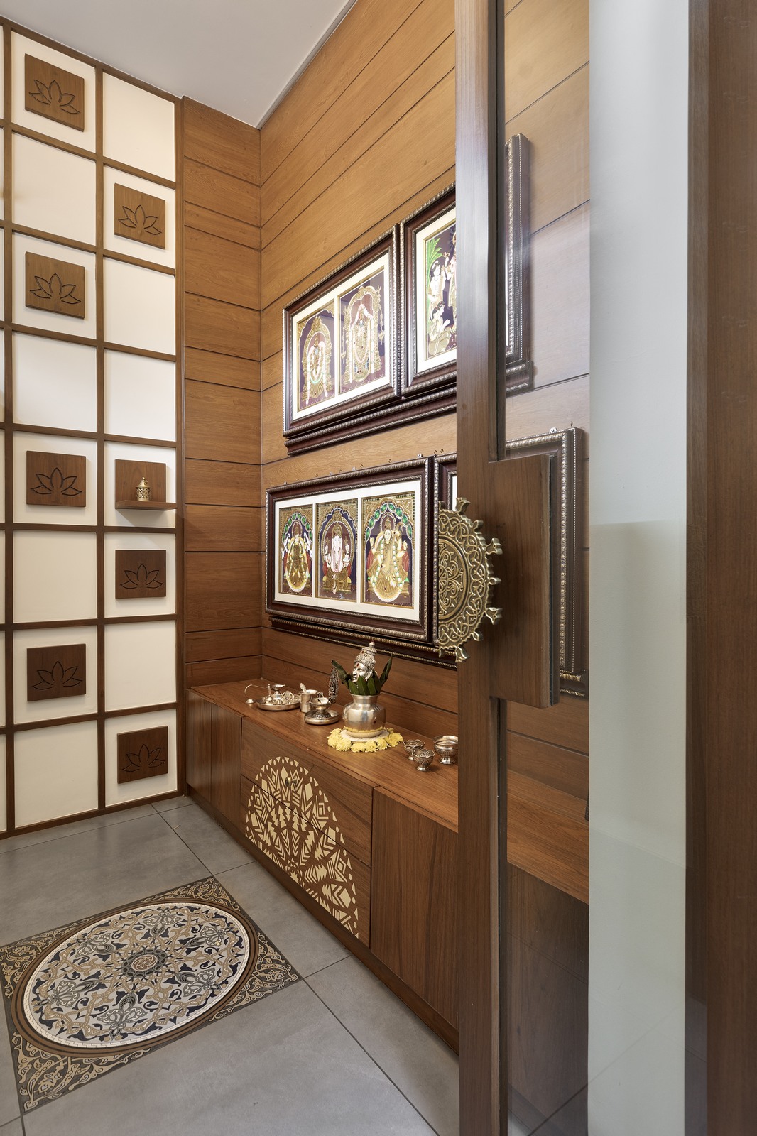 As sunlight filters through jaali walls and skylights, a concert of light, wood and traditional patterns resonate across this family home in Chennai. Sprawled across four levels, the Kakarla residence translates the essential principles of vastu into well articulated volumes. Contemporary spaces are juxtaposed with vernacular artworks, portraying the client’s cultural roots. Sustainable materials and construction techniques, smart home technologies and a well ventilated design leads to an energy efficient home. Vibrant living areas overlook a beautiful park that summons nature inside the house. A public staircase lifts one up to the living room through an open verandah or a thinnai (traditional Tamil raised veranda entrance), a reminder of ancestral homes. A separate private staircase and elevator runs through the four floors for its multi-generation users. Entering the house, a double-height light-well highlights the living space, creating an open dialogue between the lower public and upper private floors. One is instantly drawn to its main wall, which is a backdrop for traditional blue-and-yellow custom plaster mosaics. Subtle yet elegant, the square patterns evoke south Indian motifs and colours. These motifs are further translated into the devotional room full of bespoke brass and teakwood craftworks made by local artists.