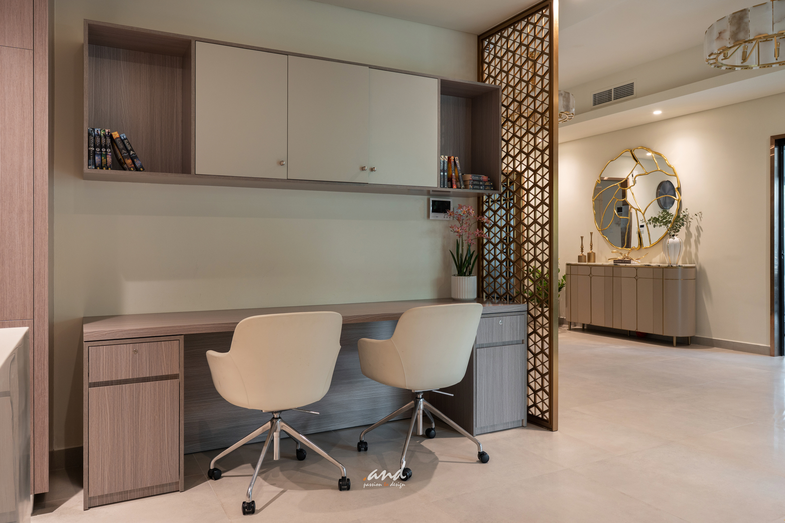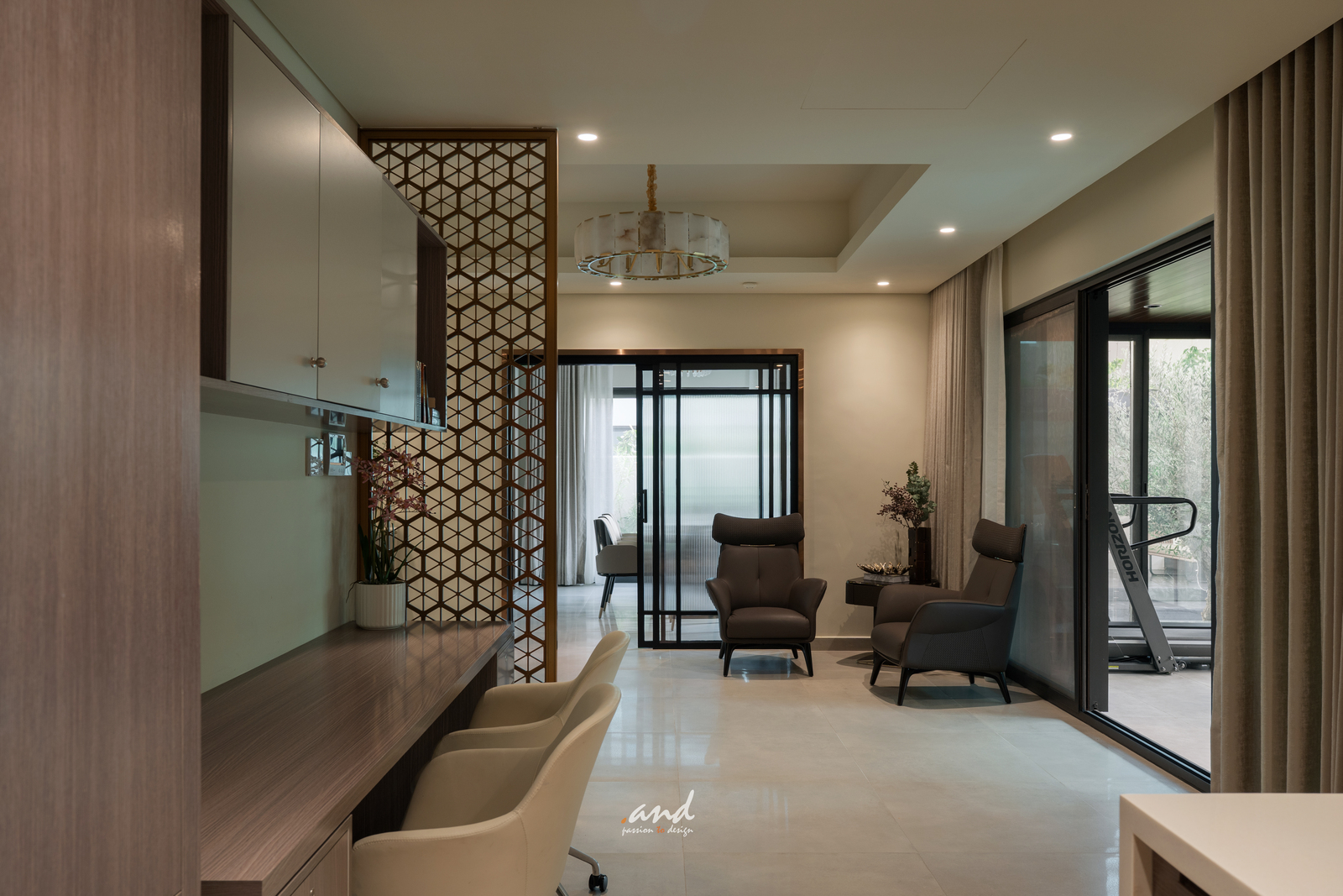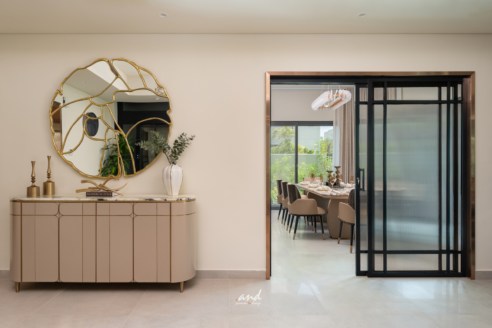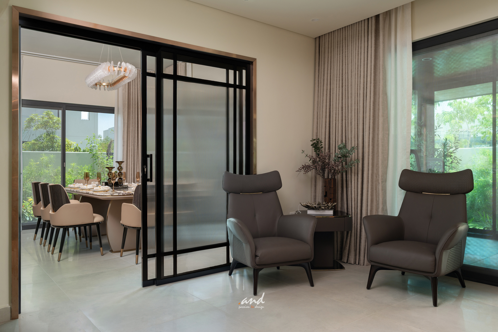 The spatial planning follows clear, intentional detailing. It guides movement and defines each zone without interrupting openness. Decorative glass panels set in modern metal frames divide formal spaces; however, they still allow natural light to pass through. As a result, the home retains an airy feel while gaining subtle privacy and layered texture.