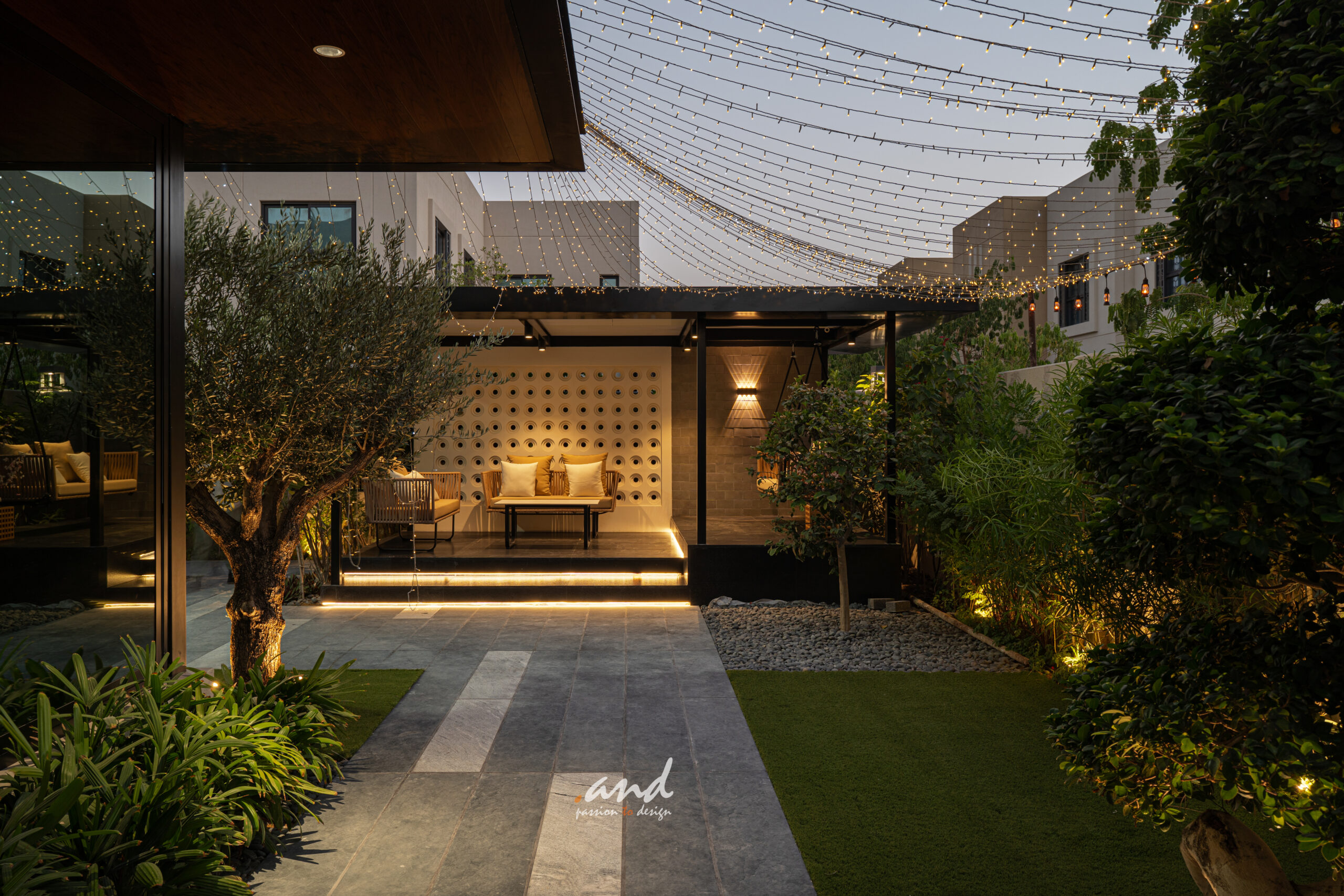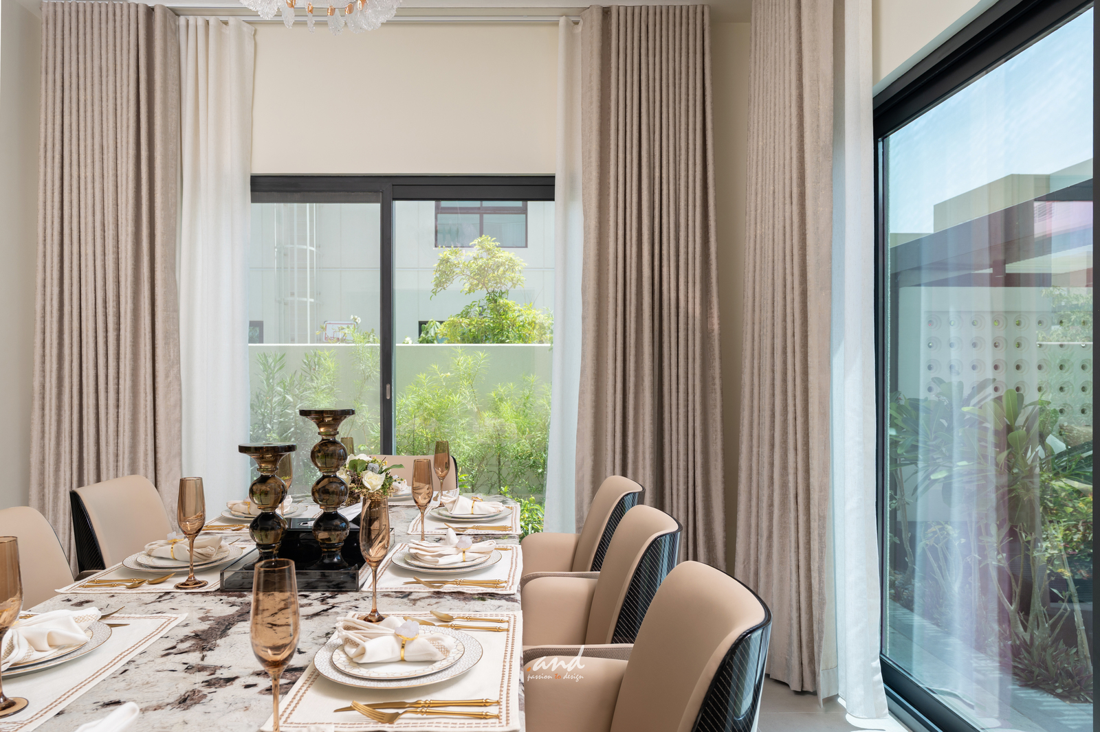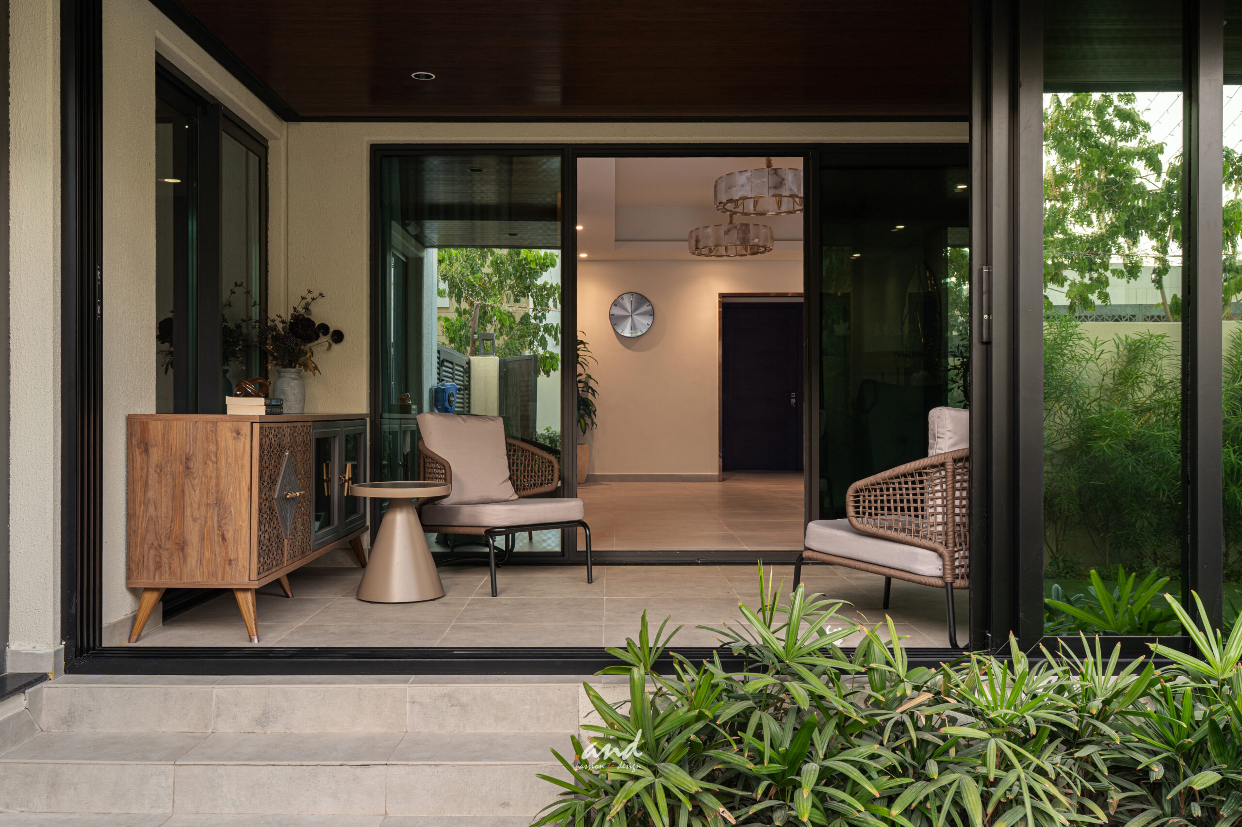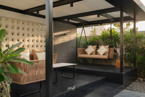 The spatial planning follows clear, intentional detailing. It guides movement and defines each zone without interrupting openness. Decorative glass panels set in modern metal frames divide formal spaces; however, they still allow natural light to pass through. As a result, the home retains an airy feel while gaining subtle privacy and layered texture.