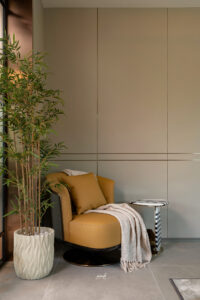 Premium materials and bespoke furniture complete the environment. Highly polished floors, custom wall panelling, and contemporary seating form the main palette. In addition, sculptural lighting and integrated metallic highlights elevate the mood across living spaces and private suites. Every surface contributes to a unified, high-end experience, ensuring the home feels tailored, cohesive, and quietly luxurious.