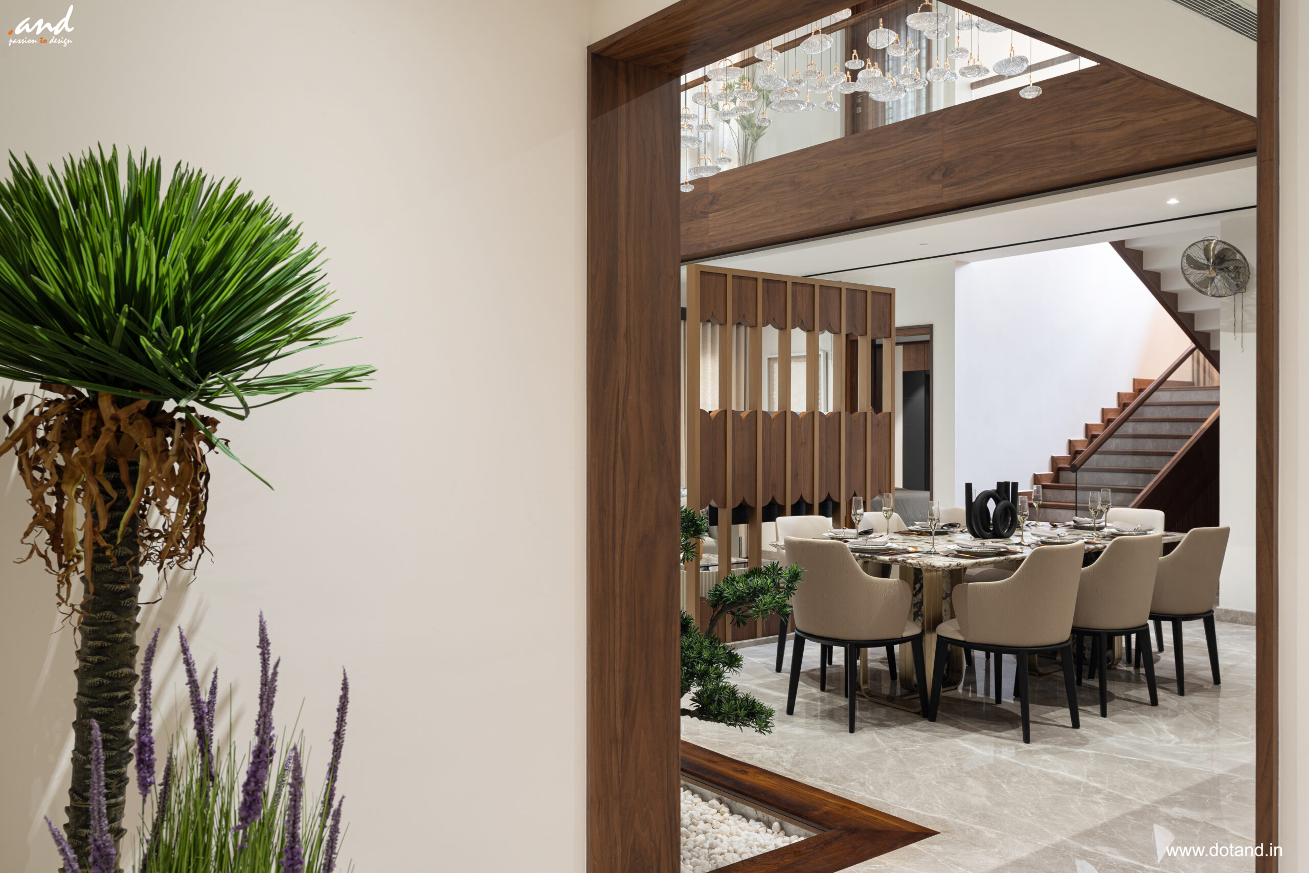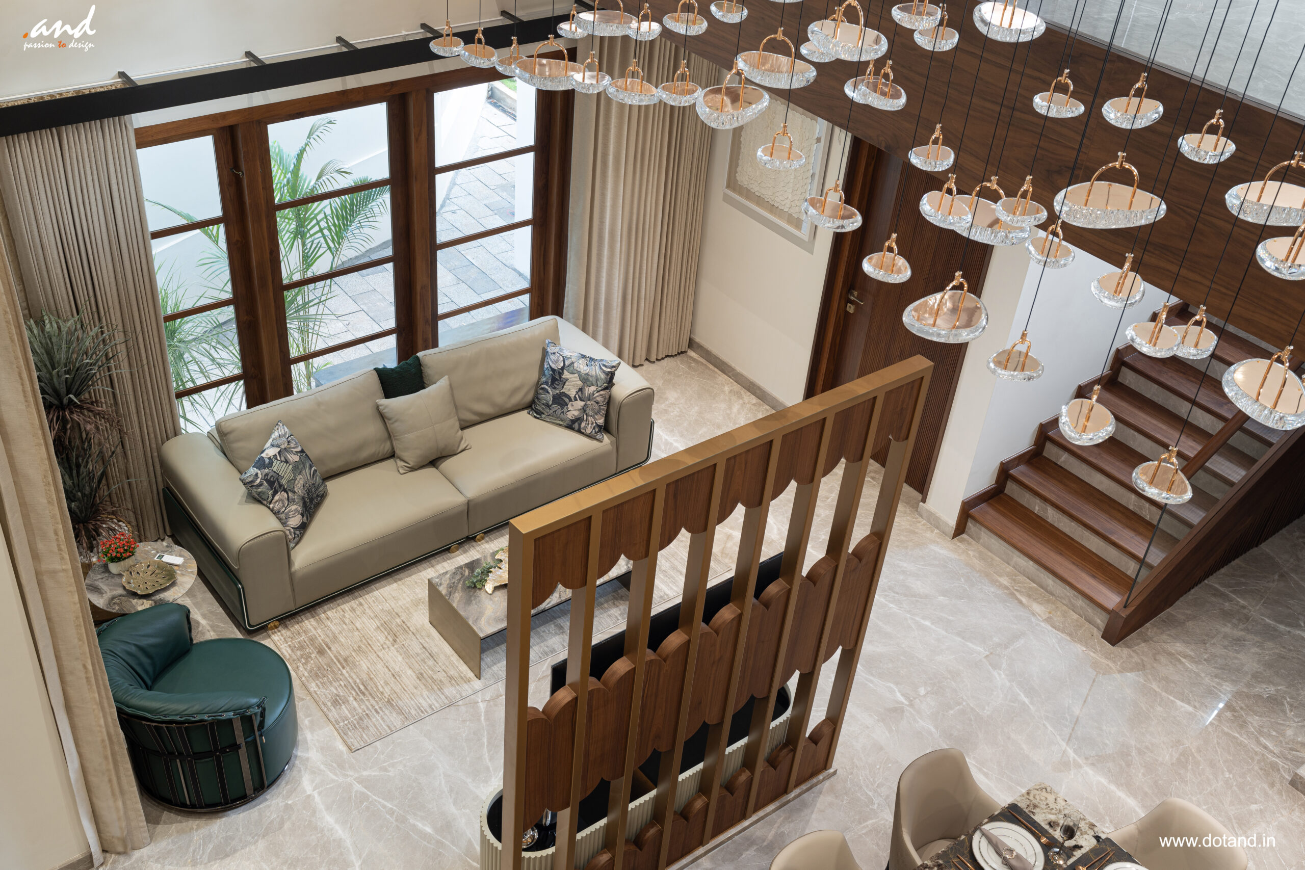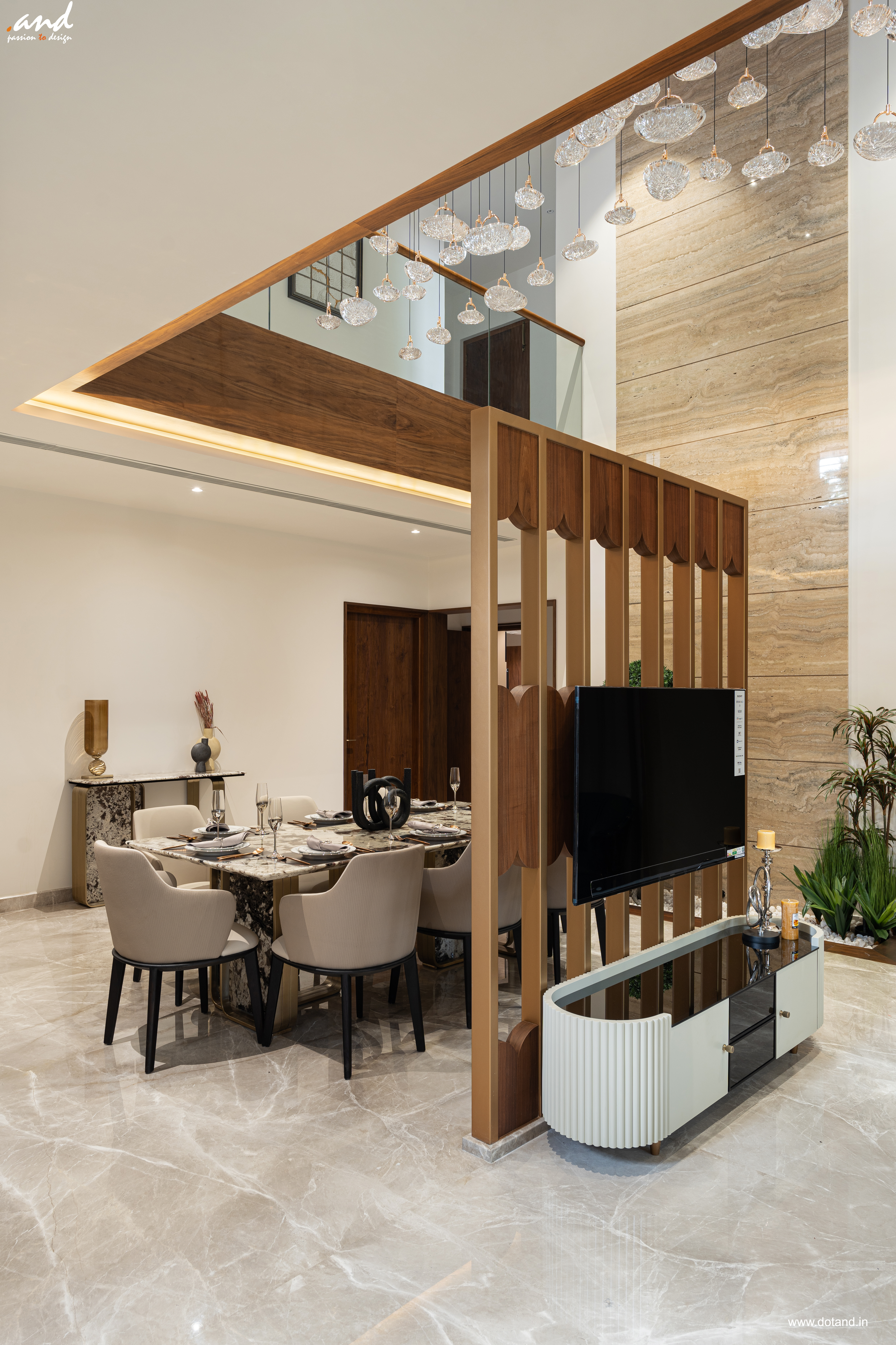 A wide driveway leads to a practical yet grand portico. Inside, neutral tones ivory, slate grey, warm wood are accented with brass, while large windows and terraces invite light and greenery in. The living area pairs open space with comfort, and the double-height dining hall features a bold stone table, cascading glass chandelier, and a sculptural black marble staircase.