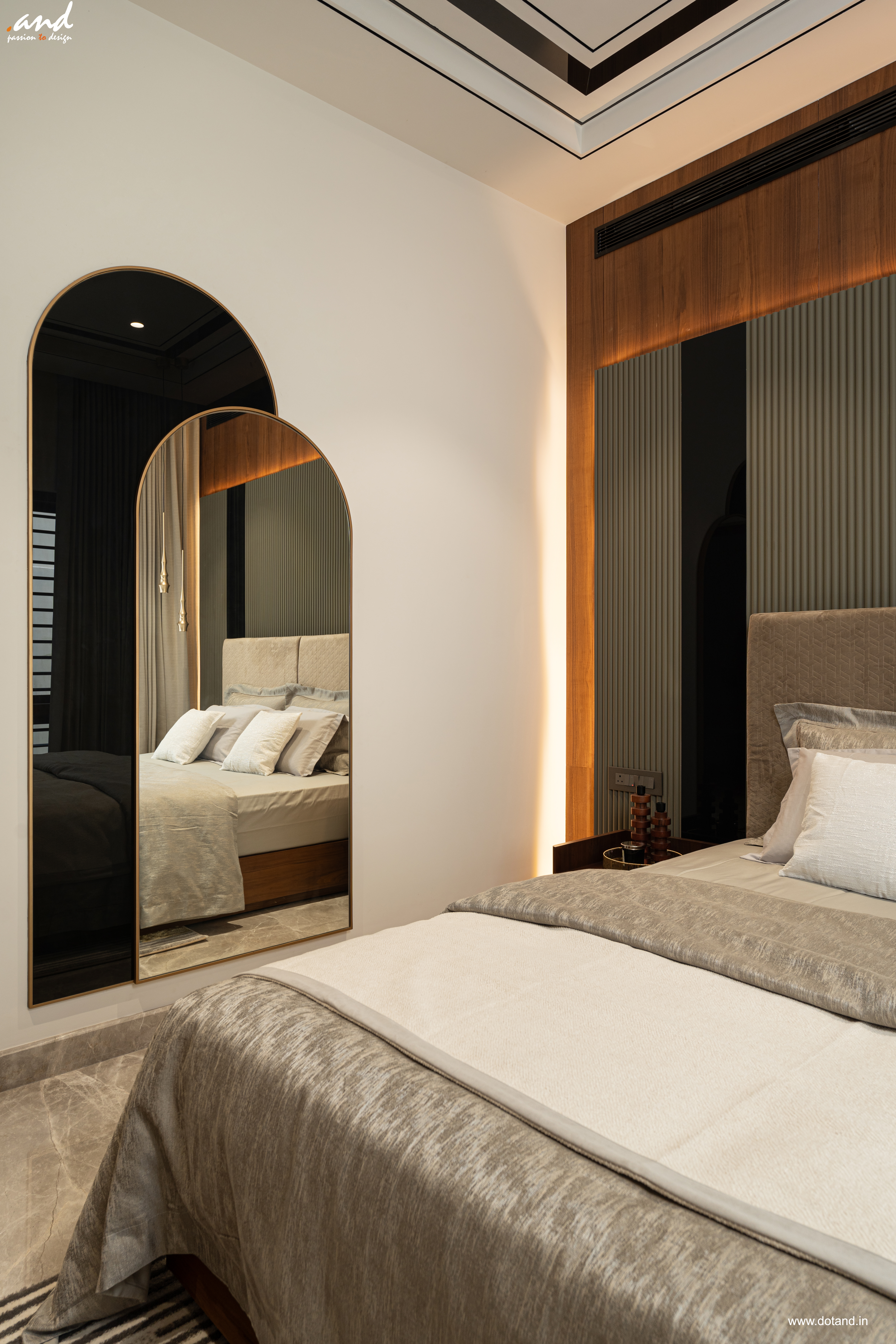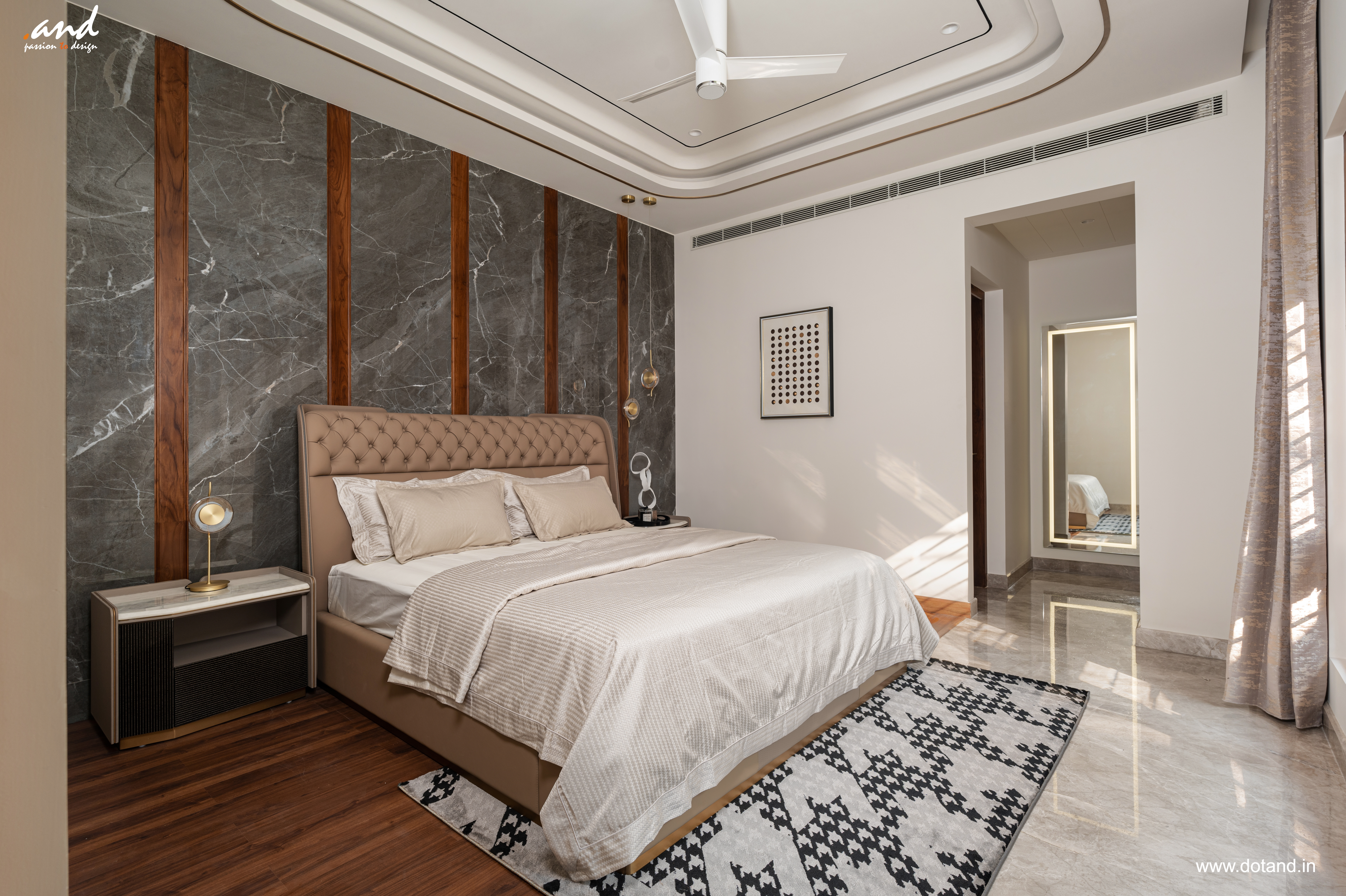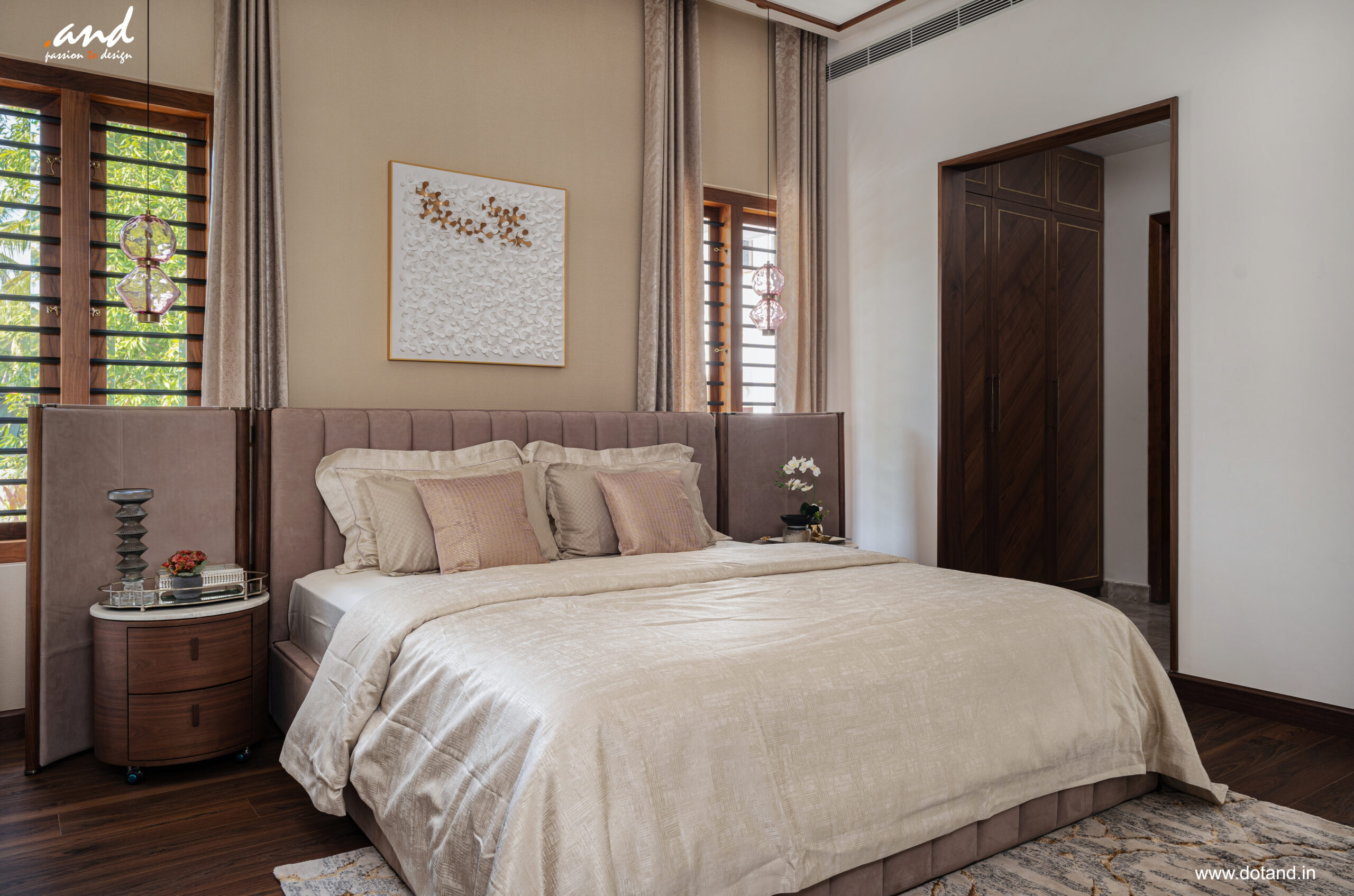 Bedrooms echo the calm palette with walnut panels, brass inlays, and soft lighting. Deep overhangs, cross-ventilation, and smart window placement ensure natural cooling, making comfort part of the architecture itself.