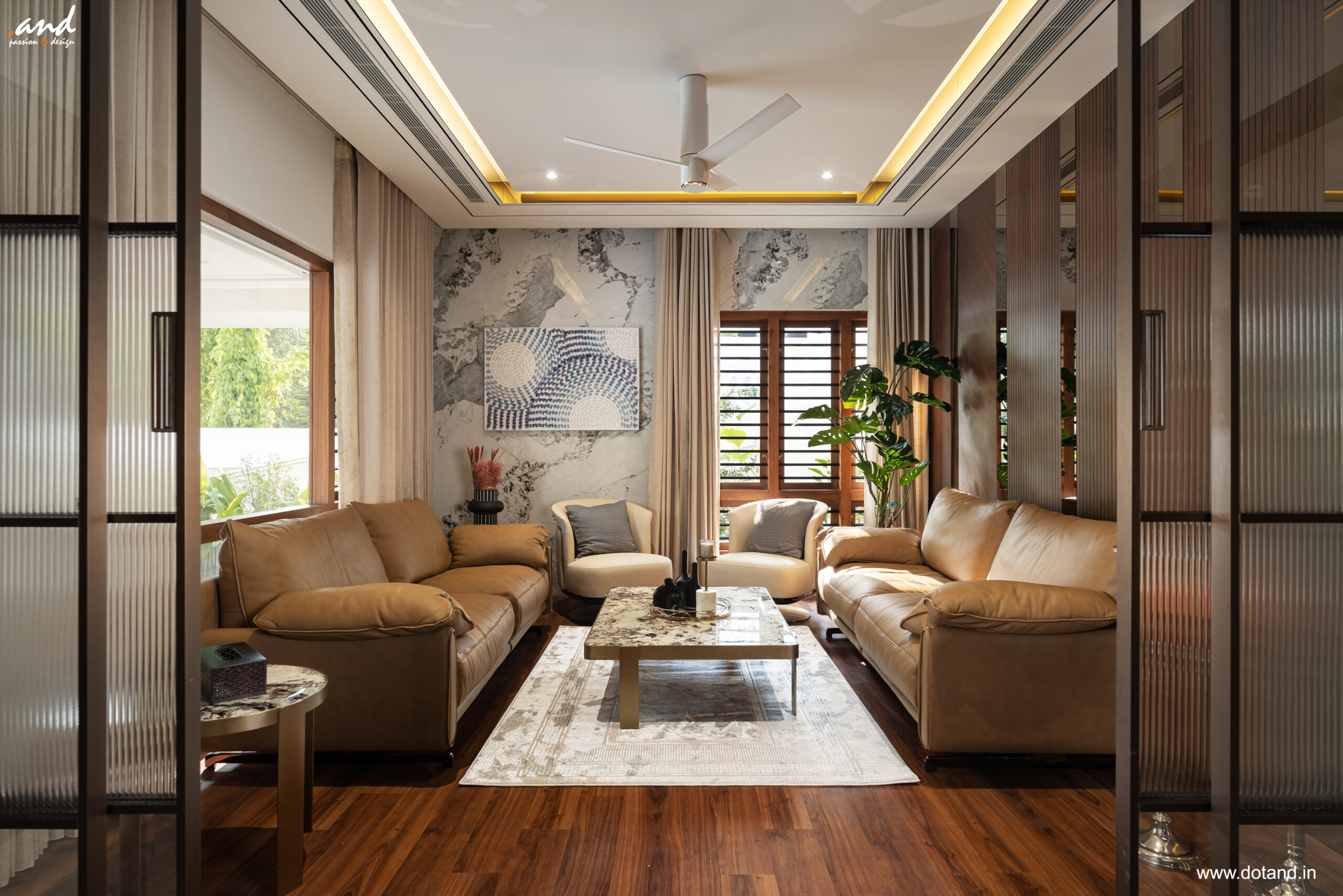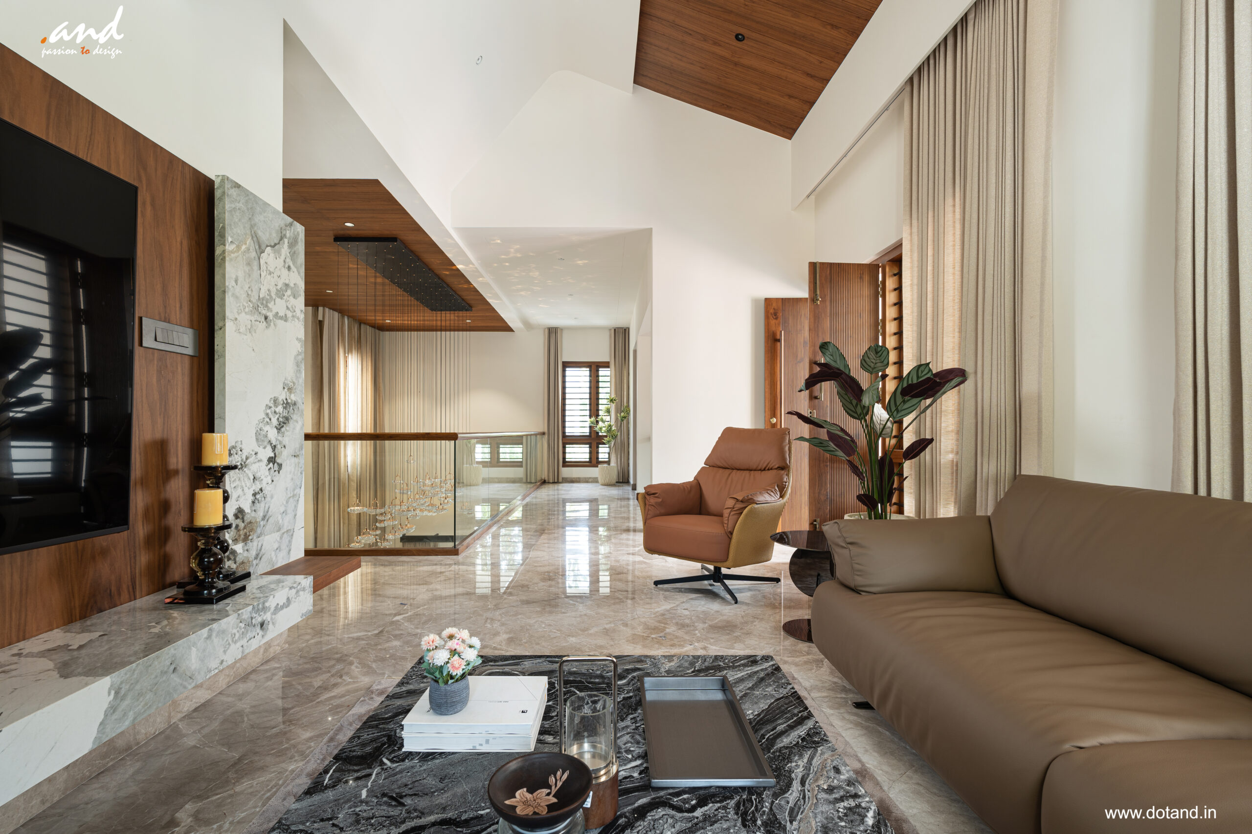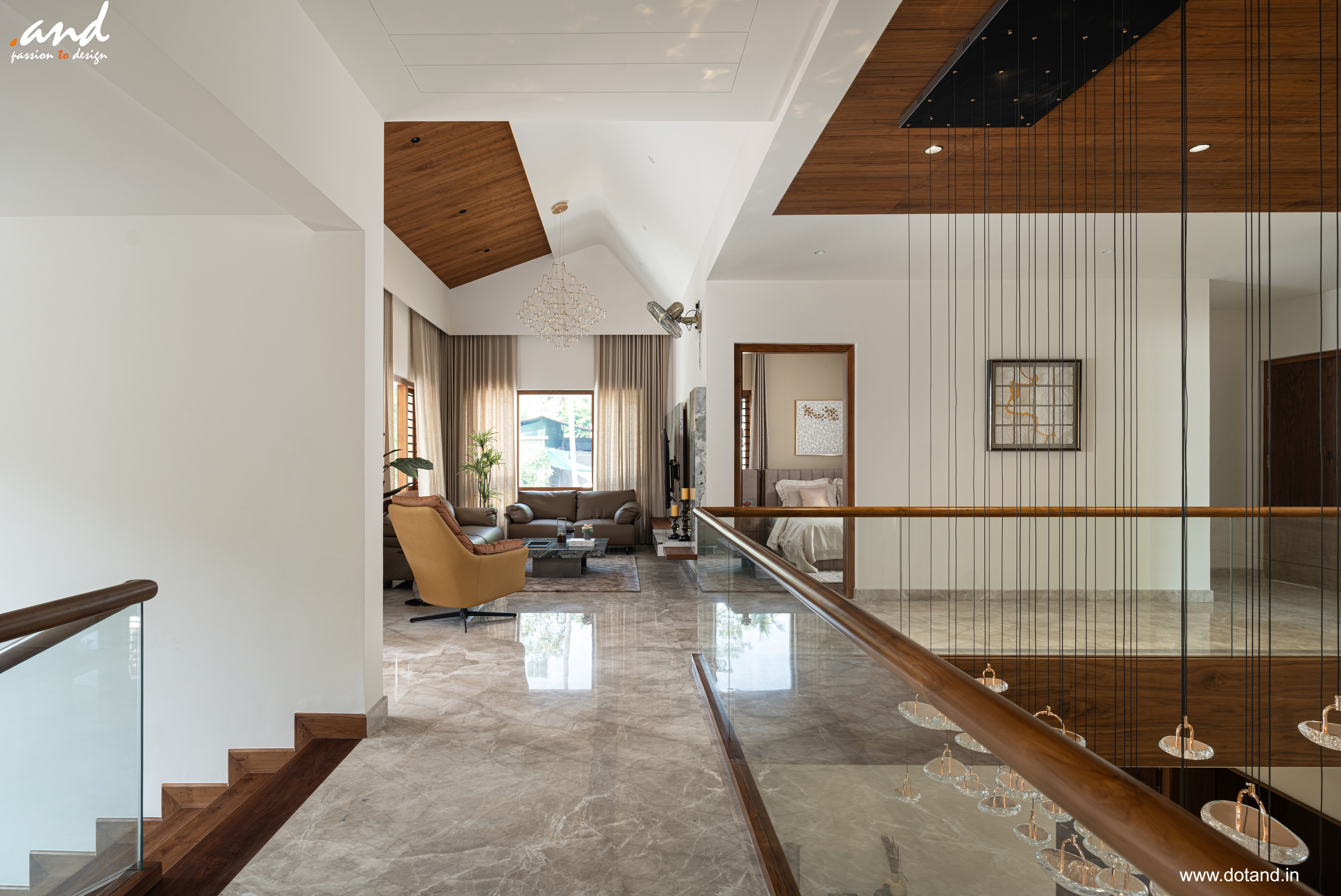 Bedrooms echo the calm palette with walnut panels, brass inlays, and soft lighting. Deep overhangs, cross-ventilation, and smart window placement ensure natural cooling, making comfort part of the architecture itself.