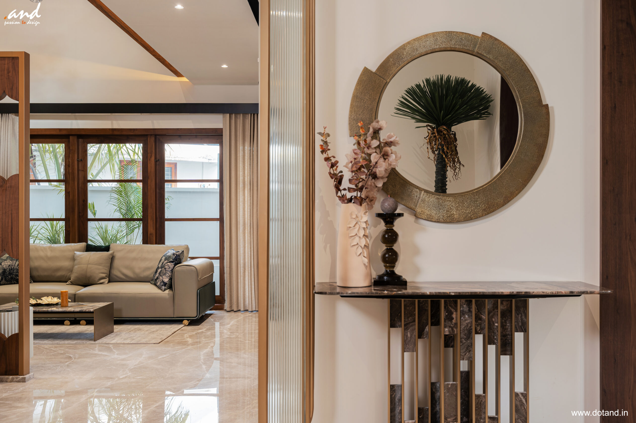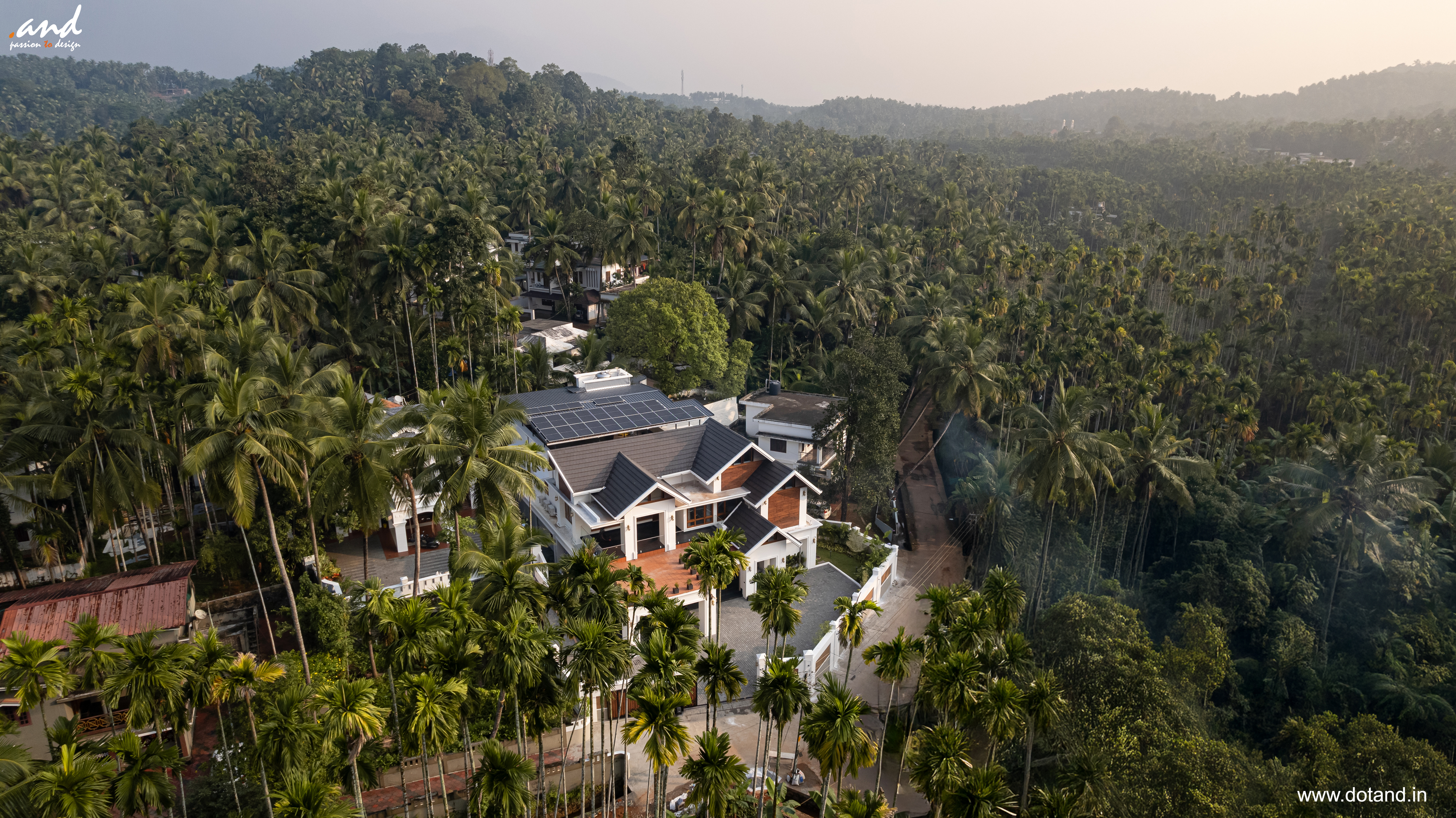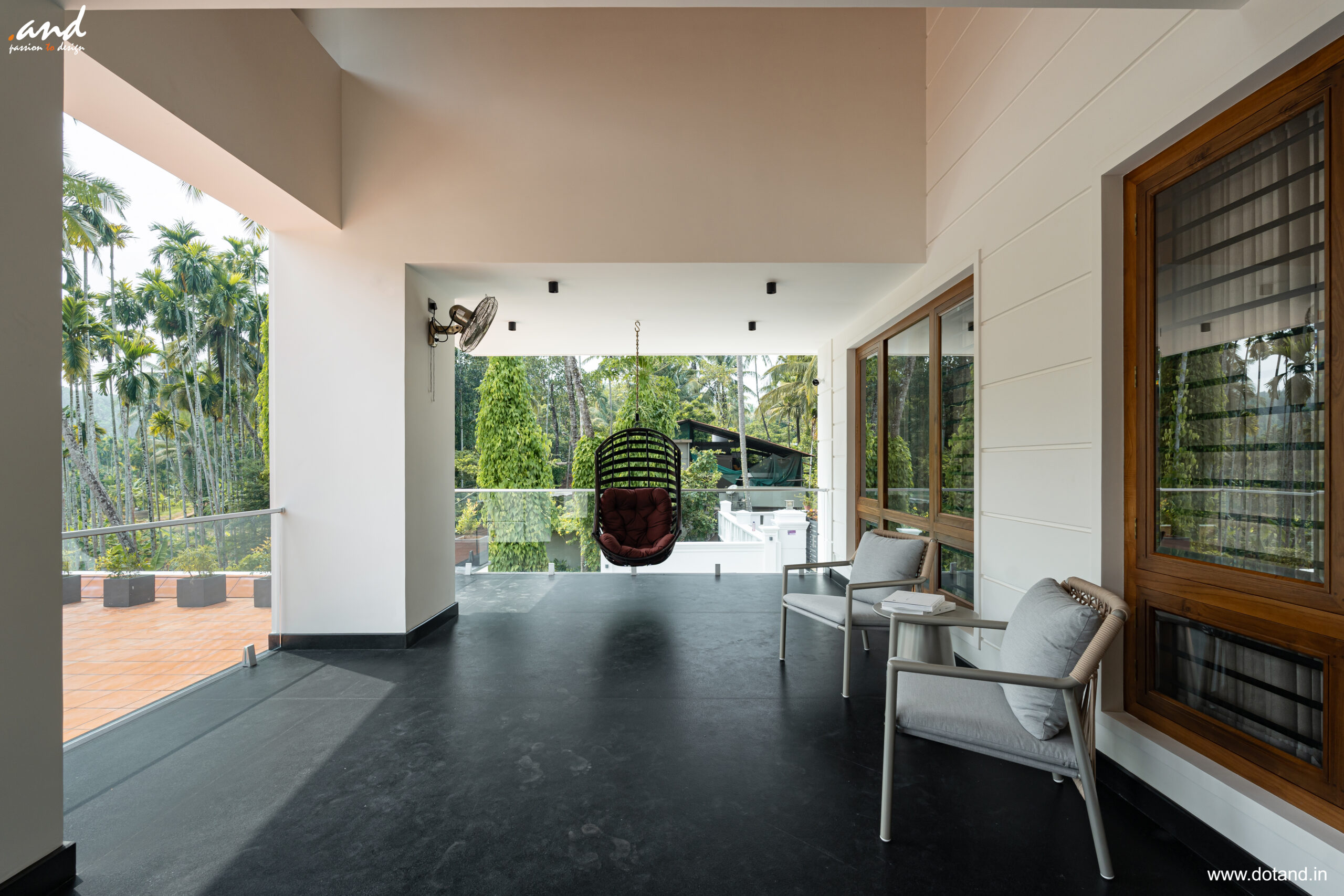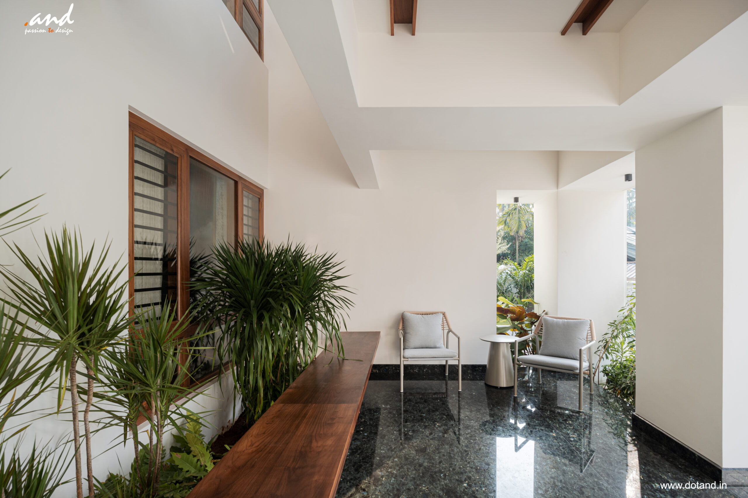 Set in Kerala’s green stretches, Thaqwa blends modern design with local tradition, favouring balance over boldness. Crisp white walls, teak-toned panels, and tall windows meet pitched gable roofs, creating a home that feels both regional and refined.